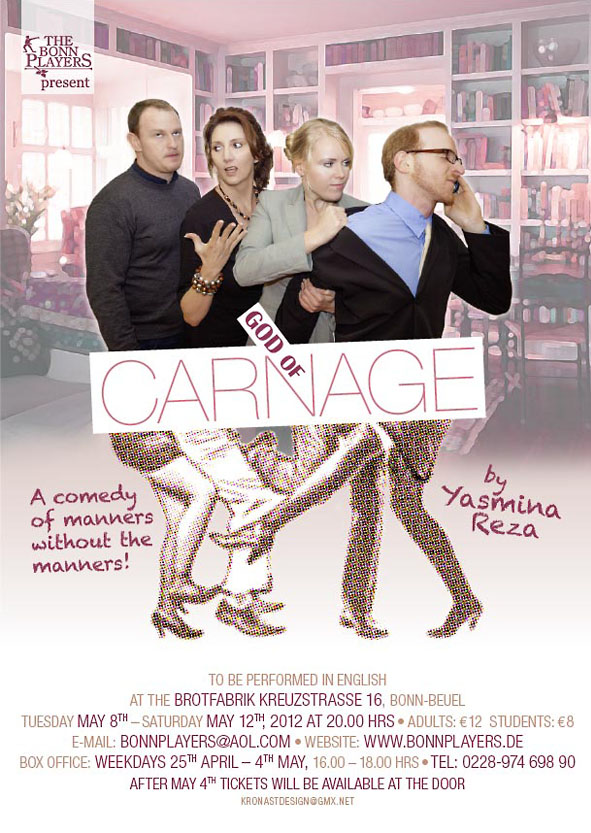 Two professional couples from a supposedly polite neighbourhood of New York City, described by one of the characters as a ‘haven of security’, meet to resolve a playground altercation between their eleven-year-old sons, which has left one of the boys slightly injured. The adults start the evening with a polite exchange of diplomatic niceties, but soon tensions begin to emerge, and fuelled by alcohol, the meeting rapidly descends into a verbal free-for-all, leaving the couples’ liberal principles in tatters. The German word Gemetzel (from the title of the German translation Der Gott des Gemetzels) perhaps describes most aptly this complete abandonment of mutual respect and dignity.